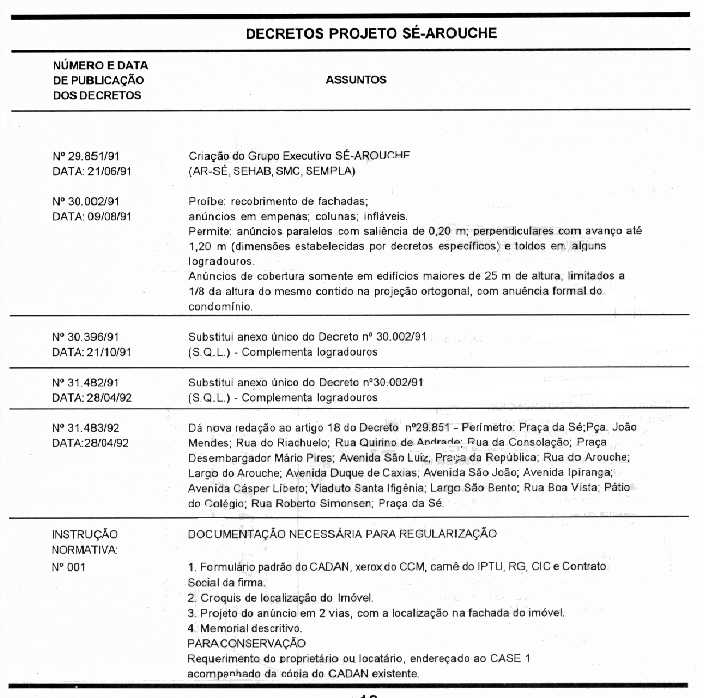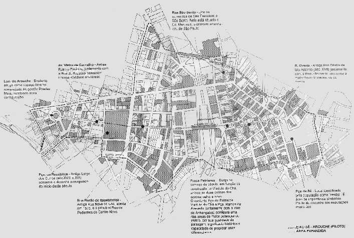 O Decreto 29.851/91 formalizou o Eixo Sé-Arouche e o grupo que coordenou as ações dos diversos órgãos e programas. A área do projeto foi ampliada pelo Decreto 31.620/92, passando a se constituir numa mancha abrangente do Centro (figura 1). Escolhemos duas áreas estratégicas para iniciar o projeto: o Lgo do Arouche e a Vieira de Carvalho, onde havia uma Associação de Lojistas interessada na melhoria da qualidade daquele espaço como forma de salvaguardar seu comércio das pressões que chegavam até a Pça da República. Foram feitos os levantamentos e estudos, agendaram-se reuniões com os lojistas nas quais se discutiu a nova legislação de anúncios para o local. Foi racionalizada a presença de postes e placas de sinalização e suspensa a implantação de um terminal de ônibus que já se havia iniciado no Lgo do Arouche, comprometendo a qualidade daquele espaço.